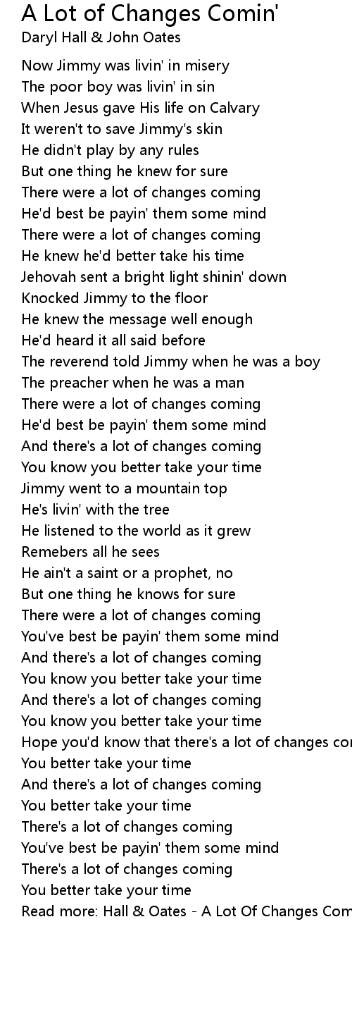 Read more: Hall & Oates - A Lot Of Changes Coming Lyrics | MetroLyrics |