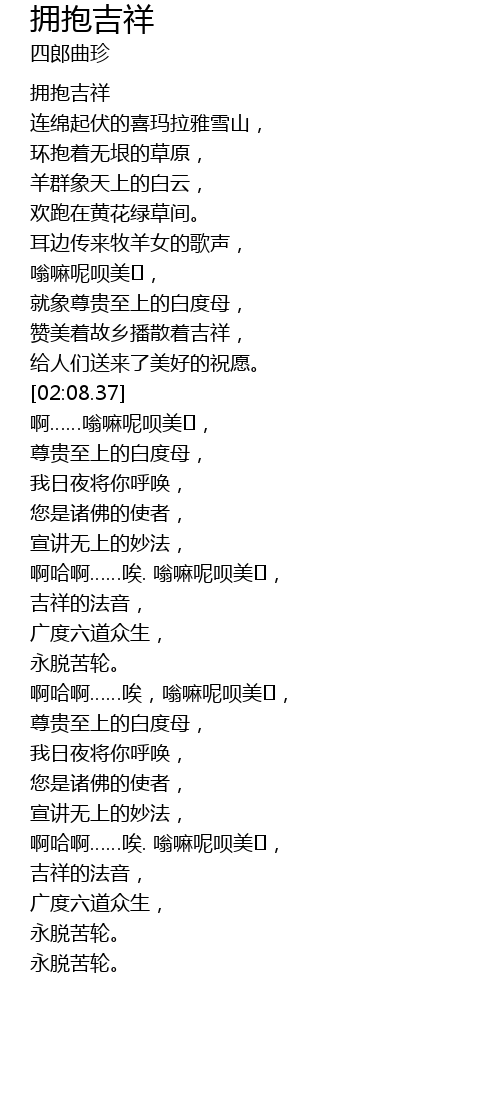 | [01:35.55] | 嗡嘛呢呗美�, |