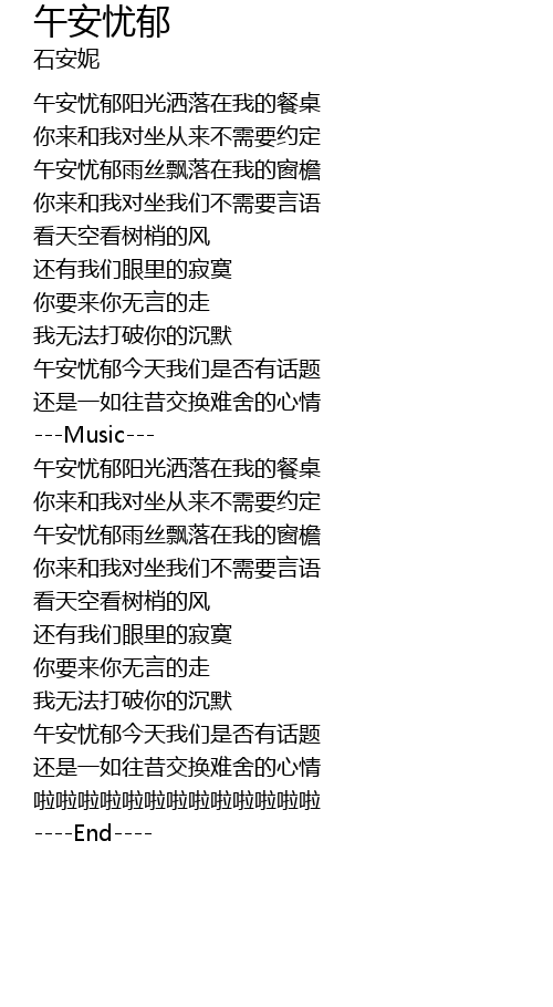 | [00:14.96] | 午安忧郁阳光洒落在我的餐桌 |