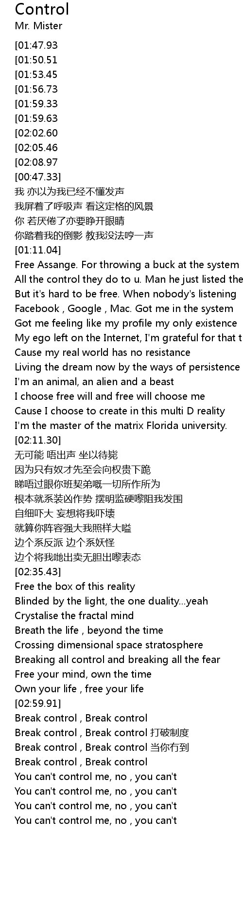 | [03:23.92] | Break control , Break control 当你冇到 |