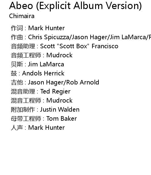| [00:00.000] | zuo qu : Chris Spicuzza Jason Hager Jim LaMarca Rob Arnold |