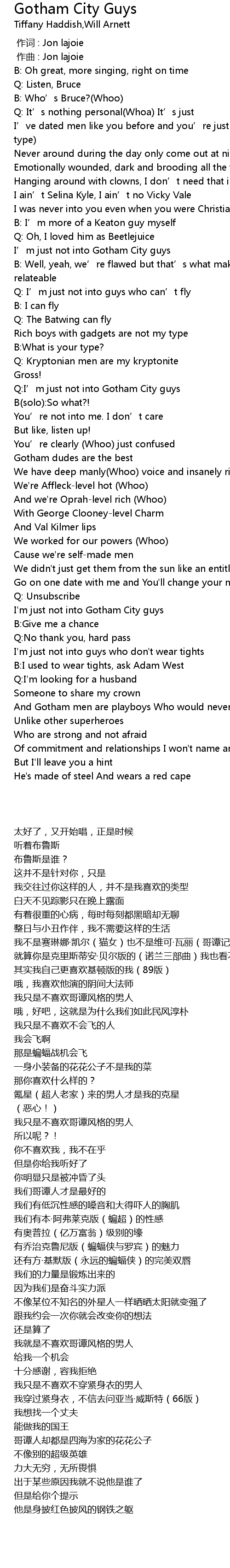 | [01:51.000] | And Gotham men are playboys Who would never settle down |
