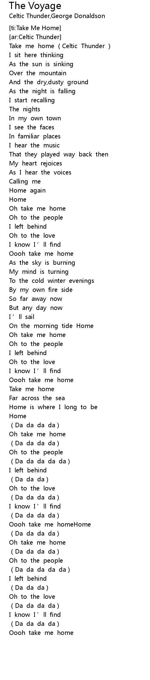 | [00:01.00] | Take me home Celtic Thunder |