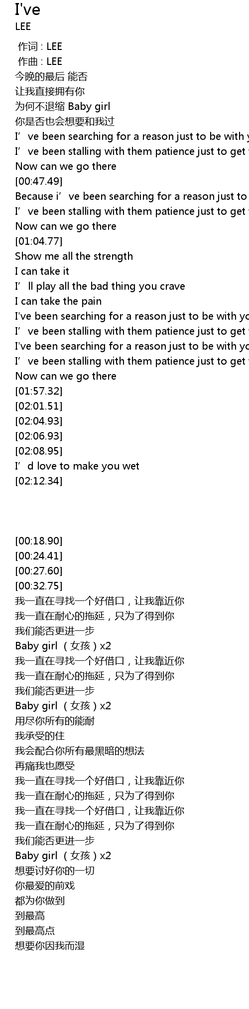 | [00:40.13] | I' ve been stalling with them patience just to get with you |