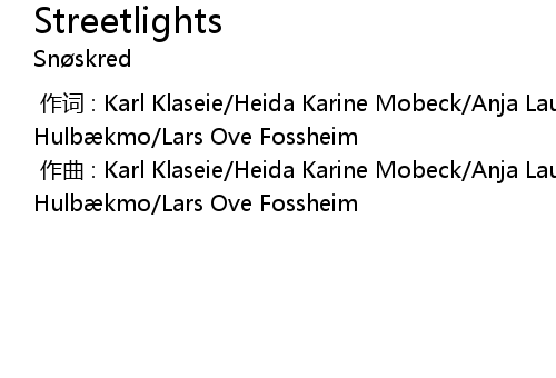 [00:00.000] 作词 : Karl Klaseie/Heida Karine Mobeck/Anja Lauvdal/Hans Hulbækmo/Lars Ove Fossheim