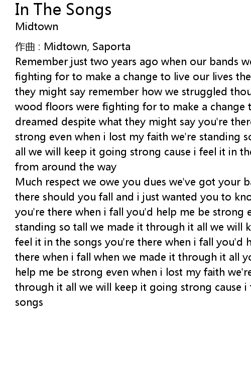 | Remember just two years ago when our bands were playing house shows were fighting for to make a change to live our lives the way we dreamed despite what they might say remember how we struggled though remember nights we spent on hard wood floors were fighting for to make a change to live our lives the way we dreamed despite what they might say you' re there when i fall you' d help me be strong even when i lost my faith we' re standing so tall we made it through it all we will keep it going strong cause i feel it in the songs to all my friends from around the way | |