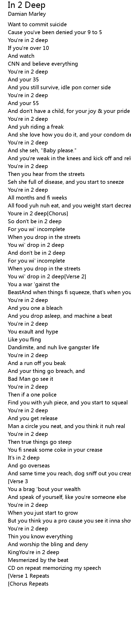 You're in 2 deep[Chorus Repeats][Verse 1 Repeats][Chorus Repeats][Verse 2 Repeats][Chorus Repeats]