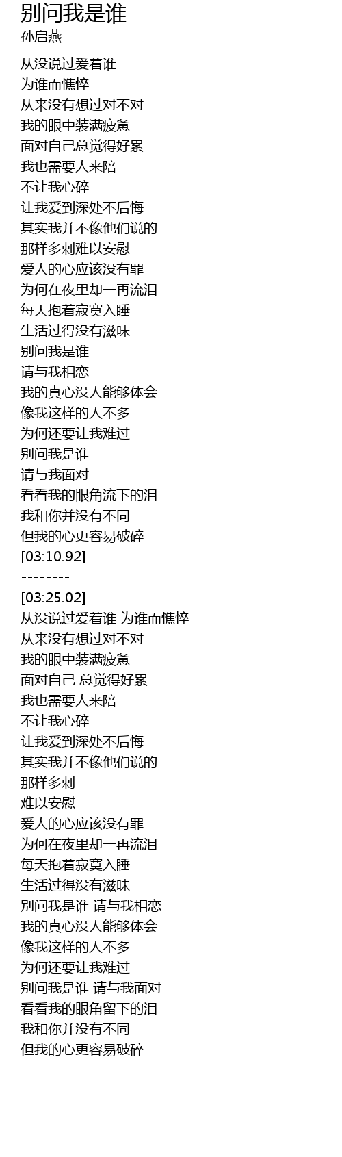 | [02:03.72] | bié wèn wǒ shì shuí |