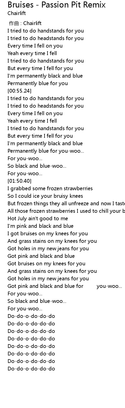 | [02:17.24] | All those frozen strawberries I used to chill your bruisy knees |