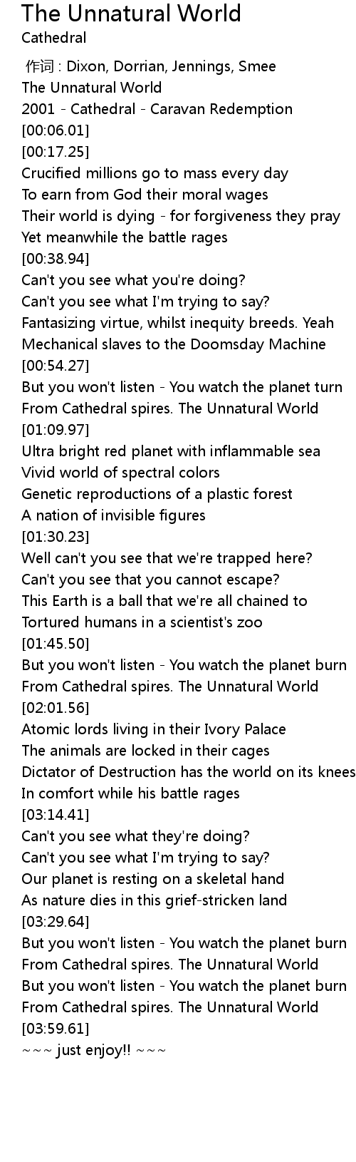 | [01:56.29] | From Cathedral spires. The Unnatural World |