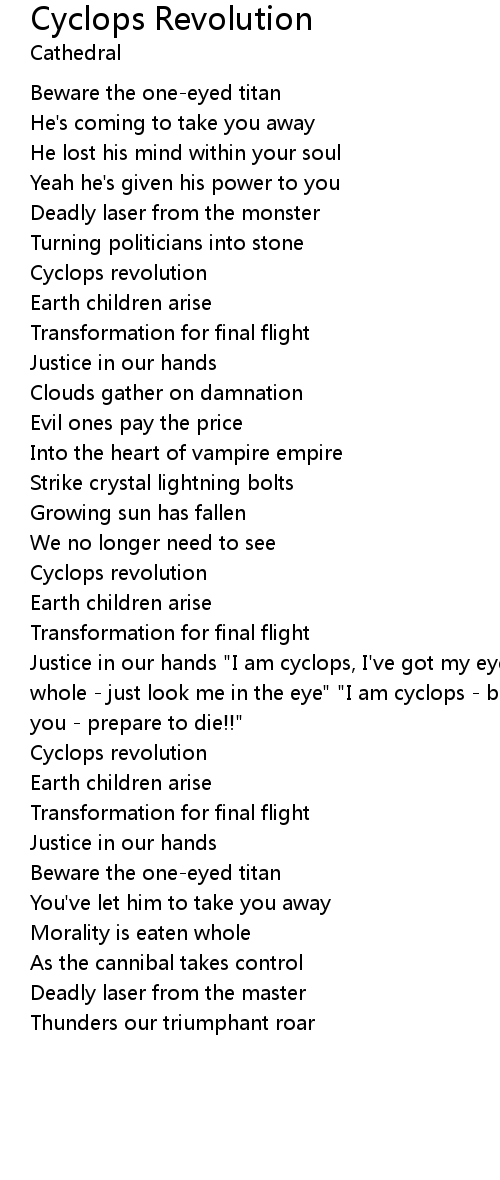 Justice in our hands "I am cyclops, I've got my eye on you I'm gonna eat you whole - just look me in the eye" "I am cyclops - beware doomed nation I stare at you - prepare to die!!" |