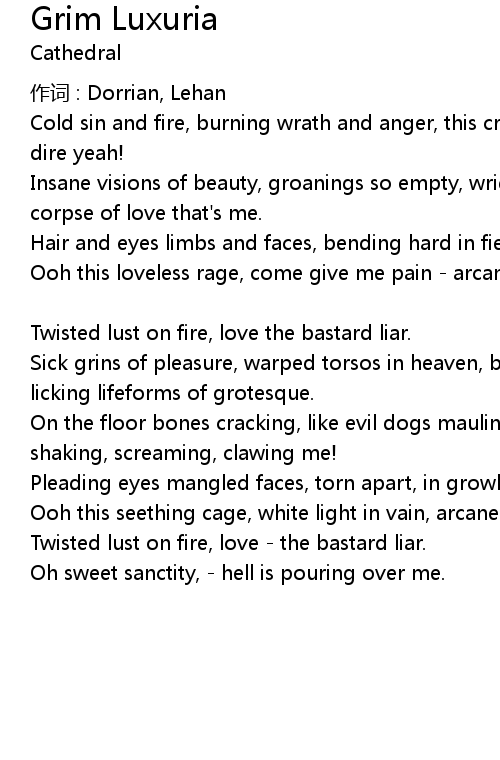 | Ooh this loveless rage, come give me pain arcane exotica, ooh grim luxuria. Chorus: | |