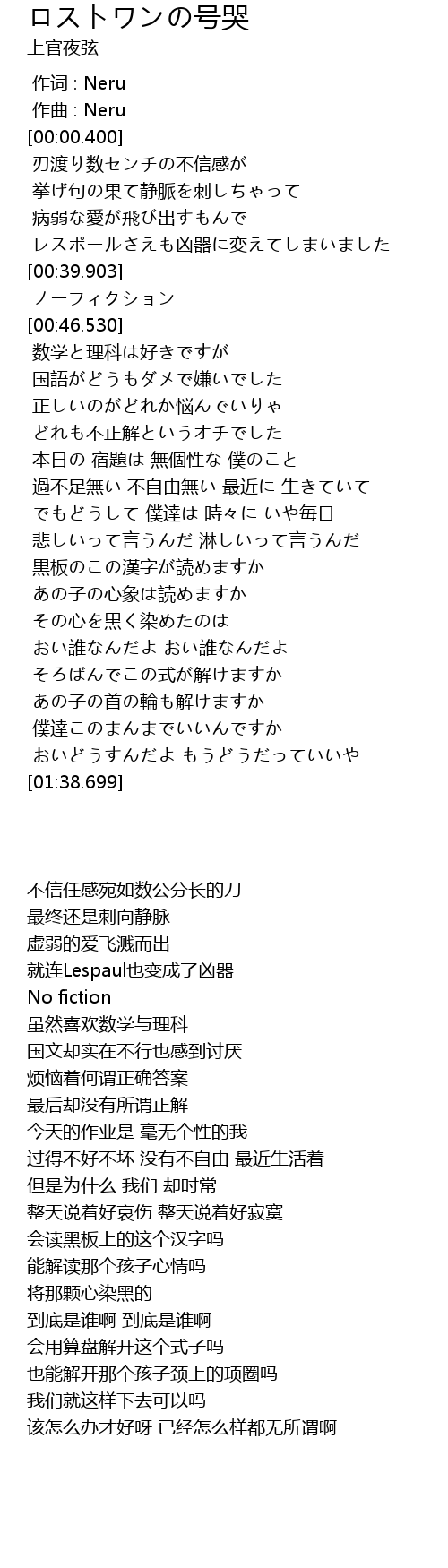 | [01:02.418] | 本日の 宿題は 無個性な 僕のこと |