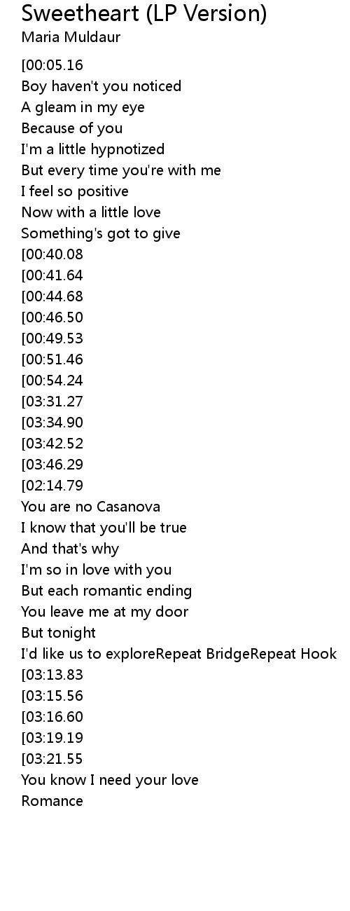 | [03:53.50][03:31.27][01:54.56][00:56.19] | Baby, won't you be my sweetheart |