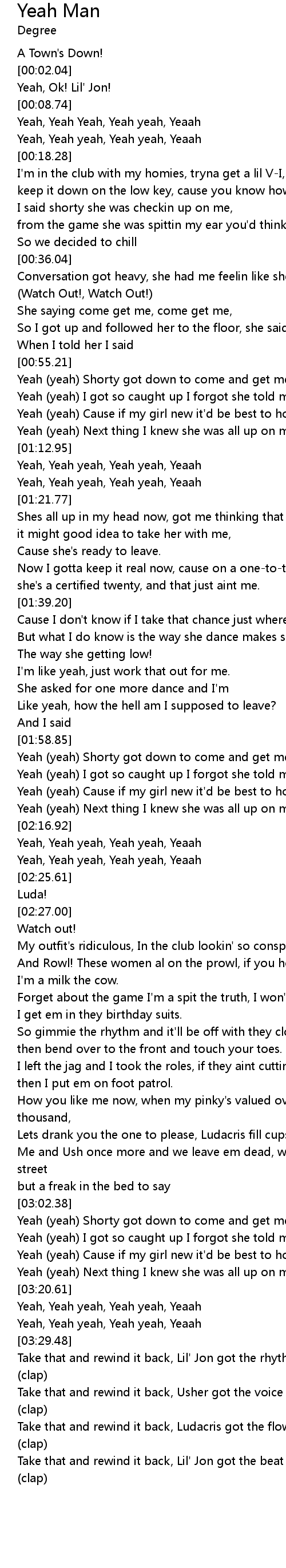 | [03:43.61] | Take that and rewind it back, Lil' Jon got the beat make ya booty go (clap) |