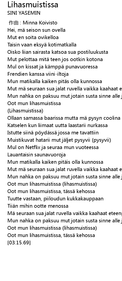 | [03:02.59] | Oot mun lihasmuistissa (lihasmuistissa) |