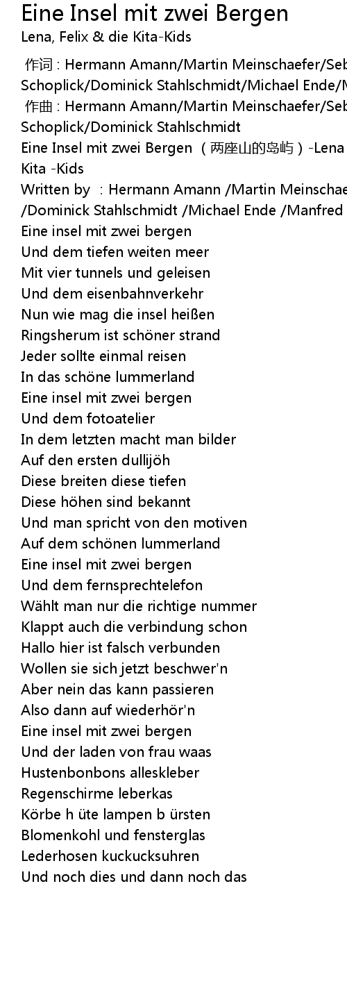 | [00:00.00] | Eine Insel mit zwei Bergen (两座山的岛屿)-Lena ,Felix &die Kita -Kids |