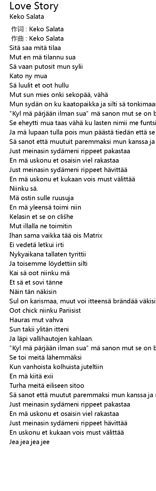 | [02:41.022] | En mä uskonu et osaisin viel rakastaa |