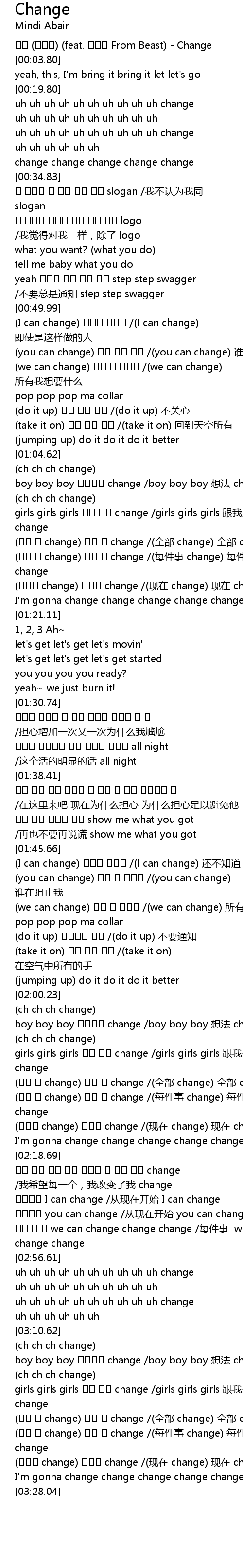 | [03:19.39] | (모두 다 change) 모두 다 change /(全部 change) 全部 change |