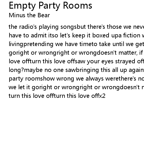 the radio's playing songsbut there's those we never getbesides this onethen we'd have to admit itso let's keep it boxed upa fiction we don't know we're livingpretending we have timeto take until we get itdoesn't matter if we let it goright or wrongright or wrongdoesn't matter, if we let it gonever turn this love offturn this love offsaw your eyes strayed offdid i hold them for too long?maybe no one sawbringing this all up againwe used to talk about itin empty party roomshow wrong we always werethere's nothing to be donedoesn't matter if we let it goright or wrongright or wrongdoesn't matter, if we let it gonever turn this love offturn this love offx2 |