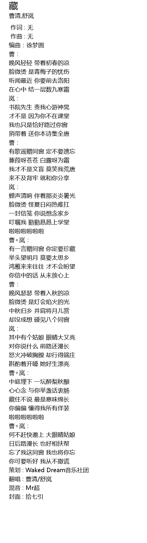 | [02:49.325] | 翻唱 : 曹清/舒岚 |