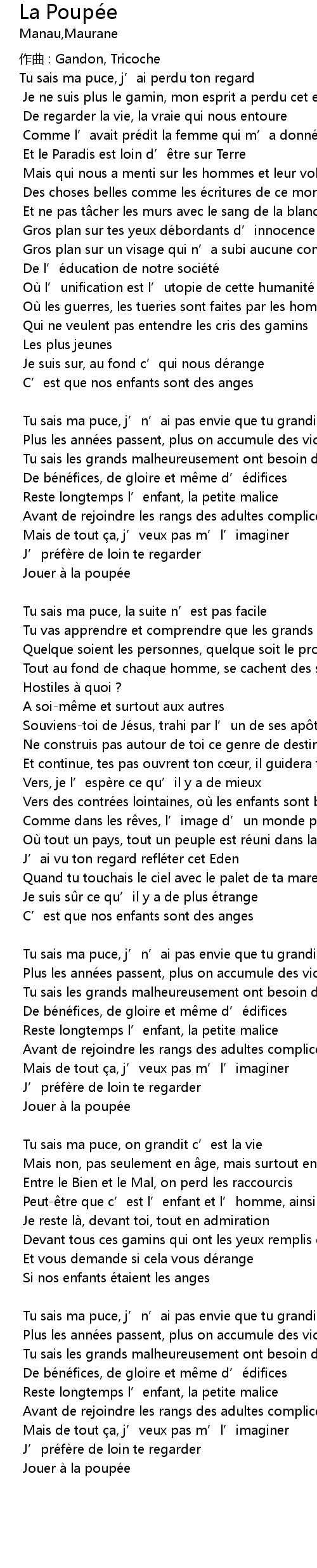 | Tu sais ma puce, j' n' ai pas envie que tu grandisses | |