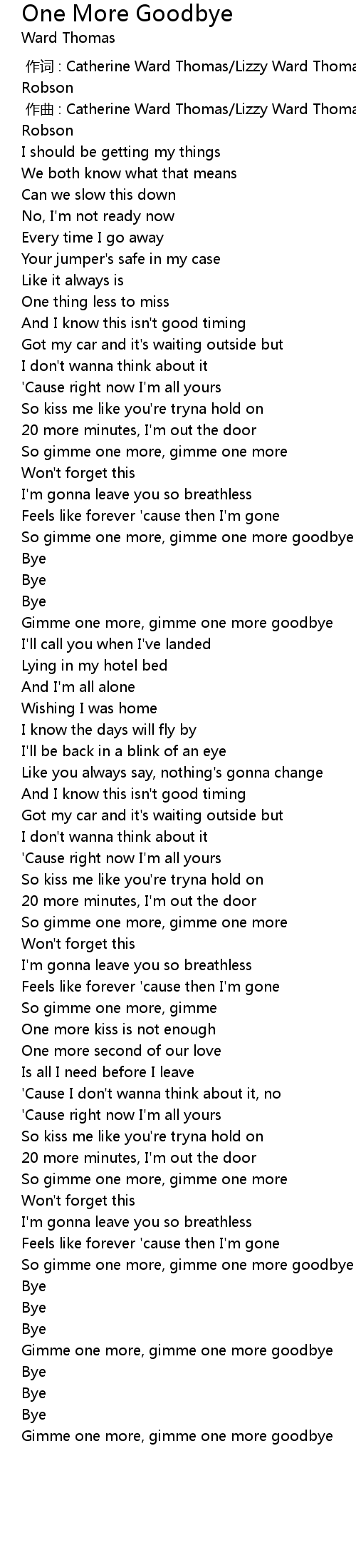 | [01:20.48] | Gimme one more, gimme one more goodbye |