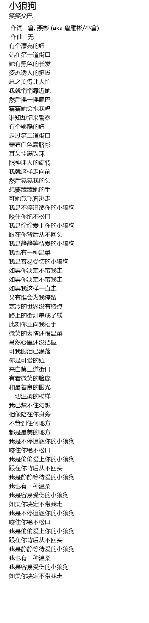 | [00:38.433] | wǒ shì bù tíng zhuī zhú nǐ de xiǎo láng gǒu |