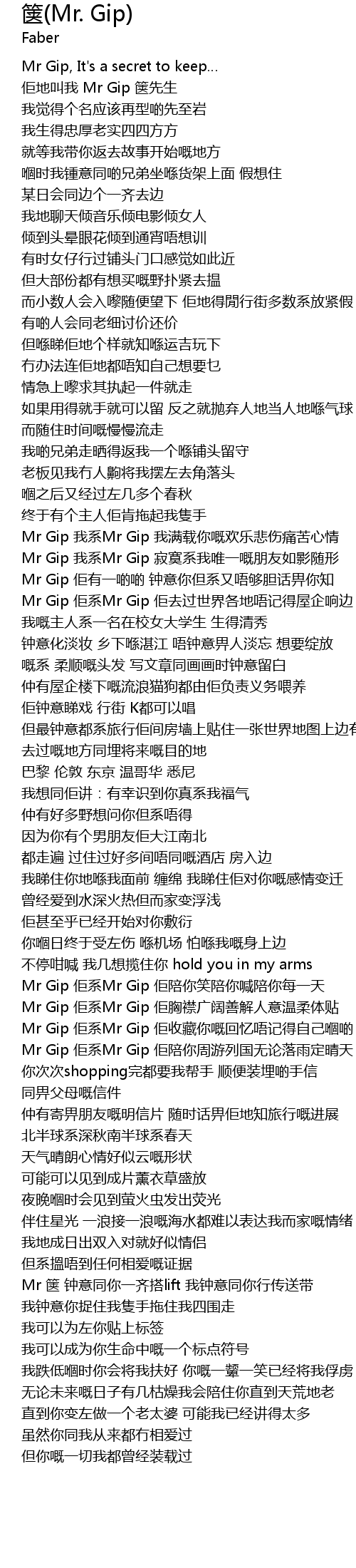 | [01:21.41] | Mr Gip 我系Mr Gip 我满载你嘅欢乐悲伤痛苦心情 |