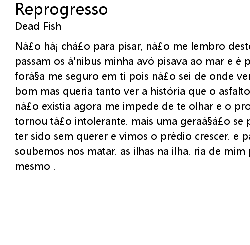 | Ná o há chá o para pisar, ná o me lembro deste lugar. aqui onde hoje passam os á' nibus minha avó pisava ao mar e é por isso que estou aqui e com forá a me seguro em ti pois ná o sei de onde venho. talvez possa até ser bom mas queria tanto ver a histó ria que o asfalto tapou. esta fumaá a que ná o existia agora me impede de te olhar e o progresso que suja o horizonte me tornou tá o intolerante. mais uma geraáá o se perdeu, isso ná o pode ter sido sem querer e vimos o pré dio crescer. e parados a ilha afundou. só soubemos nos matar. as ilhas na ilha. ria de mim pois sou o medo de vocá mesmo . |