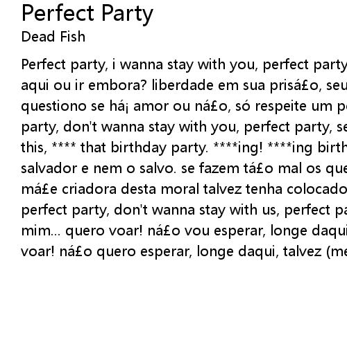 | Perfect party, i wanna stay with you, perfect party, see your smile at me. ficar aqui ou ir embora? liberdade em sua prisá o, seu limite me apavora. ná o questiono se há amor ou ná o, só respeite um pouco a minha dor. perfect party, don' t wanna stay with you, perfect party, seus olhos a denunciar. this, that birthday party. ing! ing birthday party. ná o serei o salvador e nem o salvo. se fazem tá o mal os que dizem zelar por nó s. cé lula má e criadora desta moral talvez tenha colocado essa tristeza em mim... perfect party, don' t wanna stay with us, perfect party, sentir sua raiva em mim... quero voar! ná o vou esperar, longe daqui, talvez ser feliz... quero voar! ná o quero esperar, longe daqui, talvez me encontrar. |