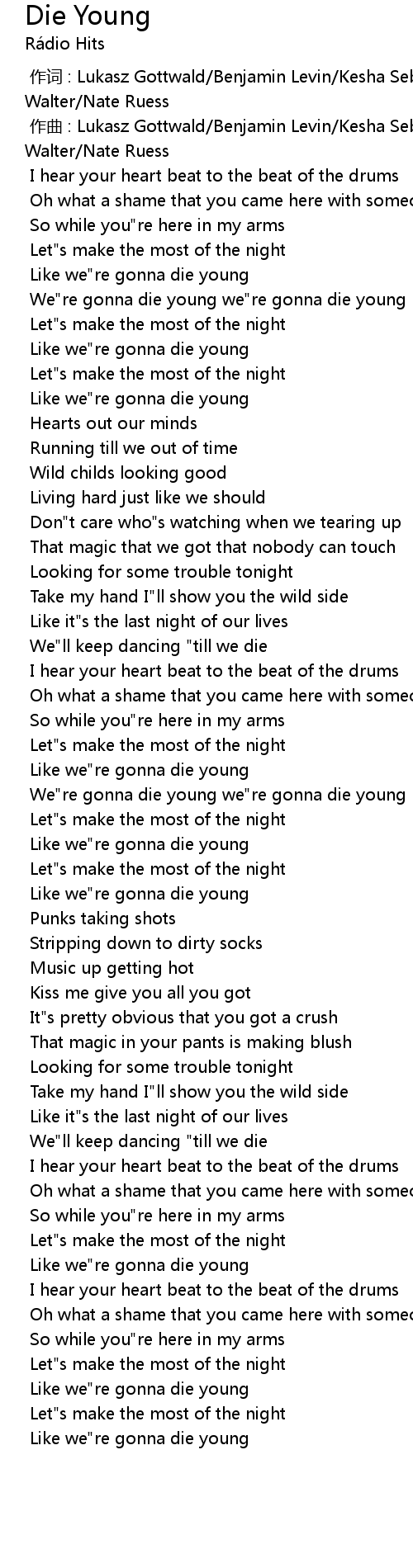 | [00:00.000] | 作词 : Lukasz Gottwald/Benjamin Levin/Kesha Sebert/Henry Walter/Nate Ruess |