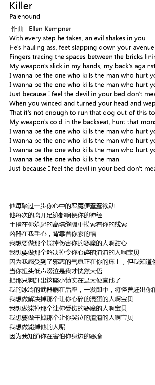 | [02:19.78] | I wanna be the one who kills the man who hurt you, darling |