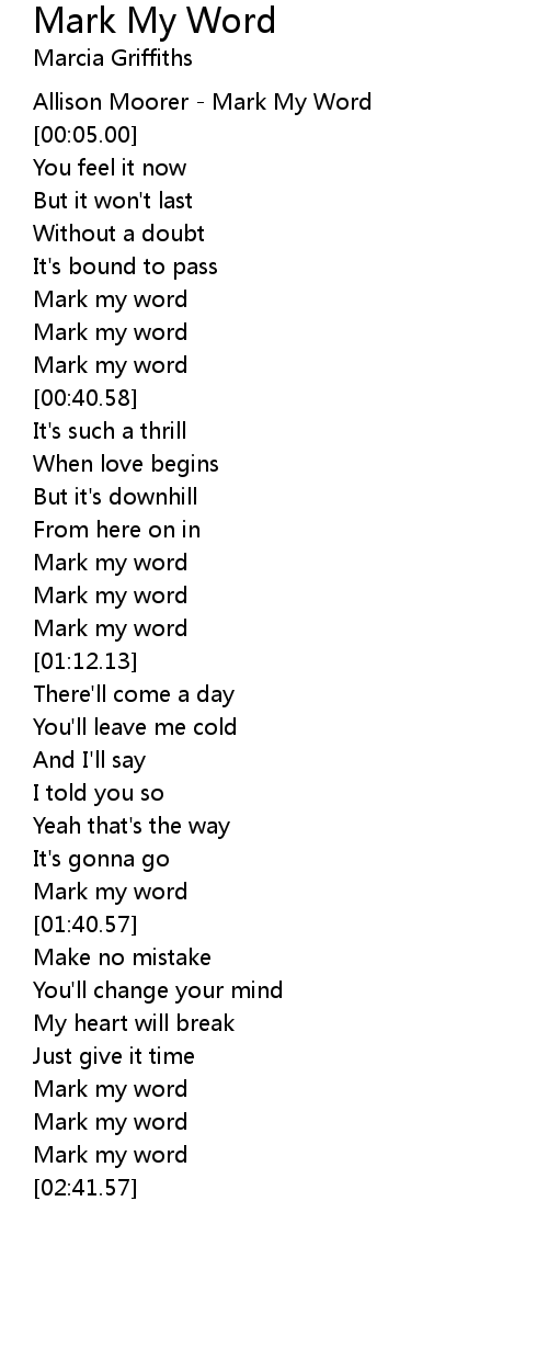 | [00:02.00] | Allison Moorer - Mark My Word |