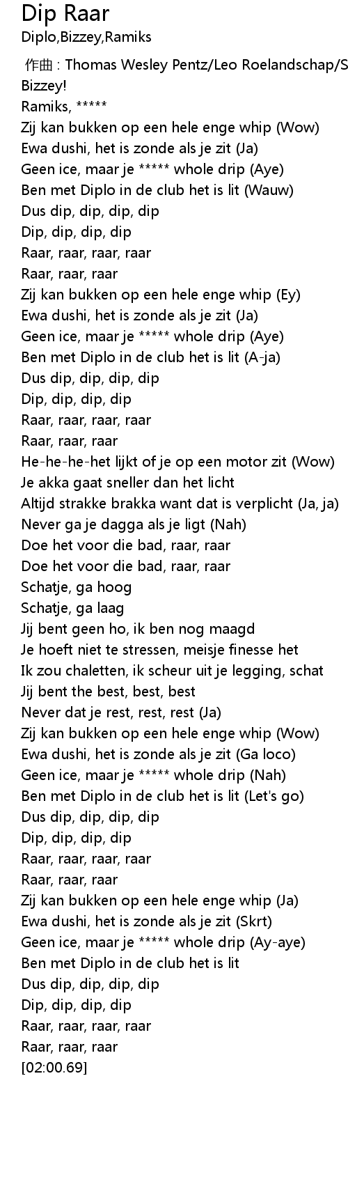 | [01:45.79] | Geen ice, maar je ***** whole drip (Ay-aye) |