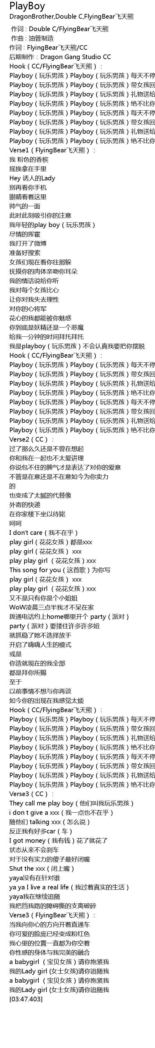 | [02:47.332] | Playboy wán lè nán hái Playboy wán lè nán hái jué bù bǐ nǐ chà |