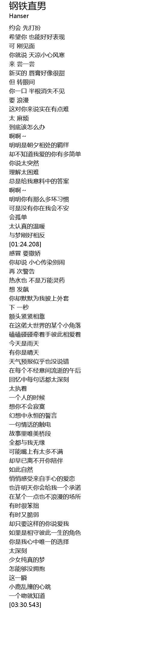 | [02:01.481] | nǐ què mò mò wèi wǒ pī shàng wài tào |