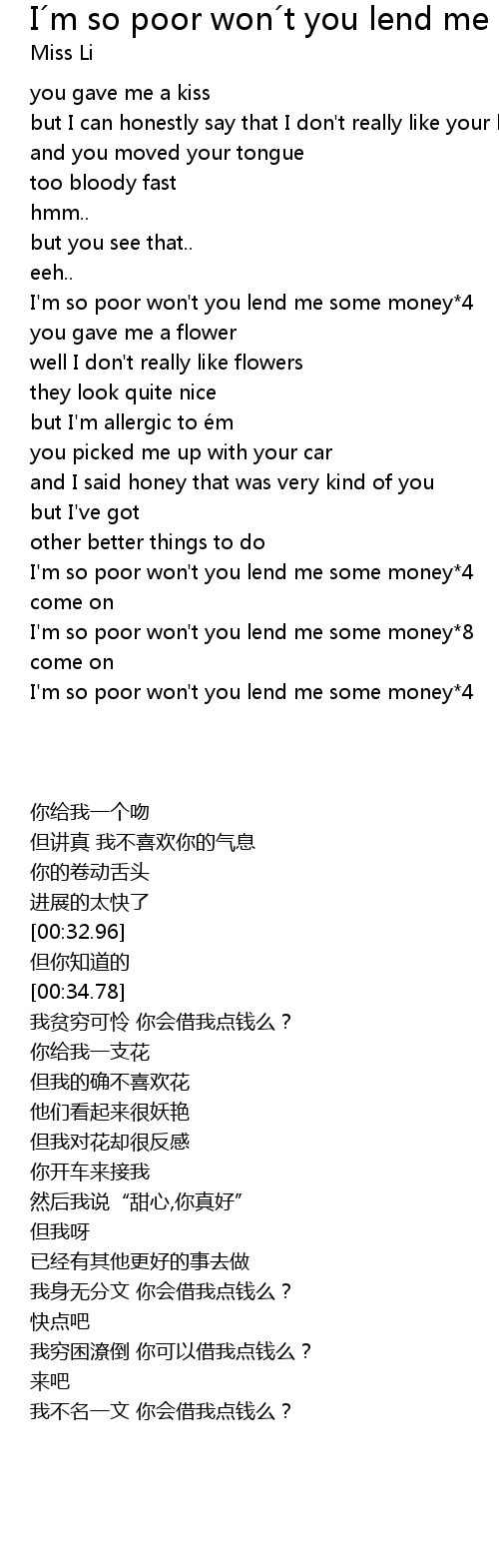 | [00:37.67] | I' m so poor won' t you lend me some money 4 |