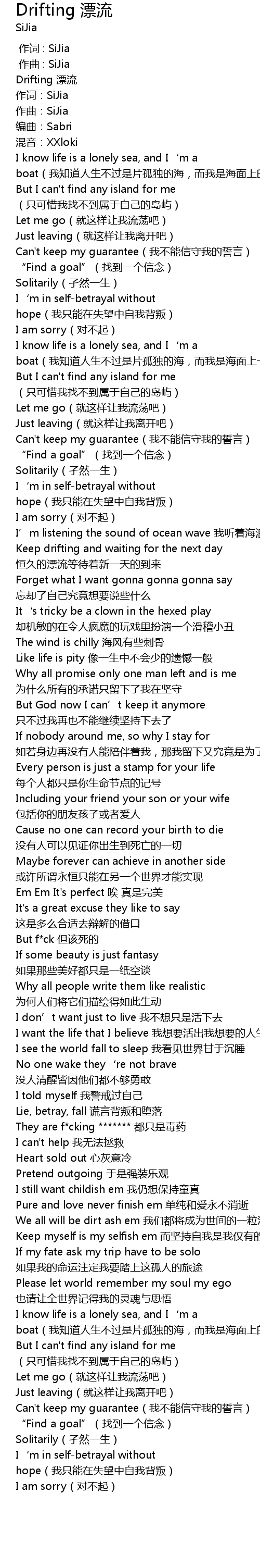 | [00:25.932] | But I can' t find any island for me zhǐ kě xī wǒ zhǎo bu dào shǔ yú zì jǐ de dǎo yǔ |