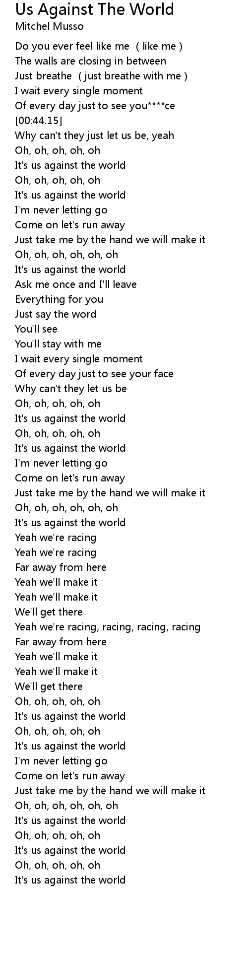 | [02:00.16] | It' s us against the world |