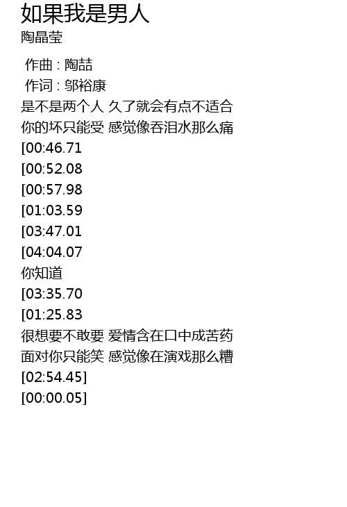 | [04:14.95][04:04.07][03:52.64][03:41.65][03:30.03][02:27.62][01:13.73] | 如果我是男人有多好 你知道 |
