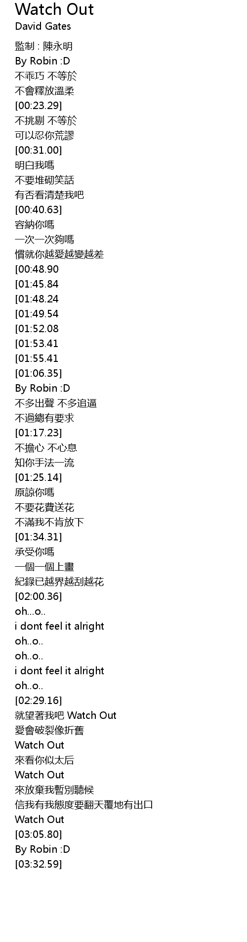 | [02:57.40][01:52.08][00:58.40] | Watch Out |