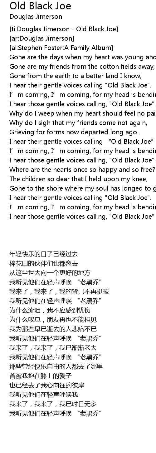 | [02:33.300] | I hear their gentle voices calling "Old Black Joe". |