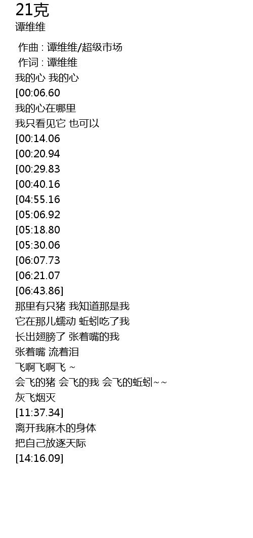 | [00:00.00] | 作曲 : 谭维维/超级市场 |