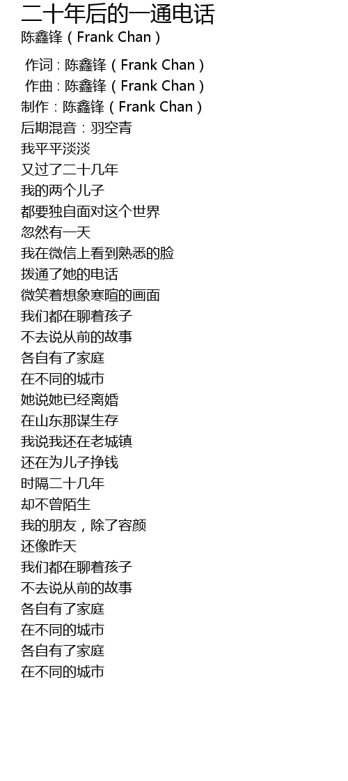 | [00:00.000] | 作词 : 陈鑫锋(Frank Chan) |