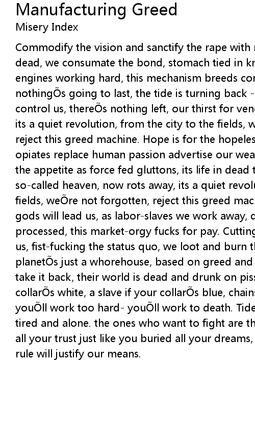 | Commodify the vision and sanctify the rape with moral antidotes wide awake and dead, we consumate the bond, stomach tied in knots, driving class relations, engines working hard, this mechanism breeds contradictions, bury expectations, nothing s going to last, the tide is turning back revocation. They cant control us, there s nothing left, our thirst for vengeance, your dying breath, its a quiet revolution, from the city to the fields, we re not forgotten, reject this greed machine. Hope is for the hopeless, dreaming for a life, as opiates replace human passion advertise our weakness, colonize our space, feed the appetite as force fed gluttons, its life in dead time, its selfdecay, their socalled heaven, now rots away, its a quiet revolution, from the city to the fields, we re not forgotten, reject this greed machine with golden eyes our gods will lead us, as laborslaves we work away, drunk and baited, packaged, processed, this marketorgy fucks for pay. Cutting through the lies that bind us, fistfucking the status quo, we loot and burn their paradiseÉ. burn. Their planet s just a whorehouse, based on greed and avarice, demand your life and take it back, their world is dead and drunk on piss. your a slave if your collar s white, a slave if your collar s blue, chains locked around your neck, you ll work too hard you ll work to death. Tides of human flotsam floating, tired and alone. the ones who want to fight are the ones who have no hope, bury all your trust just like you buried all your dreams, the ends that justify their rule will justify our means. |