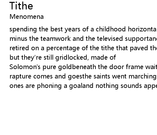 | Solomon's pure goldbeneath the door frame waiting for earthquakes after the rapture comes and goesthe saints went marching, the trumpets salving, the chosen ones are phoning a goaland nothing sounds appealing |