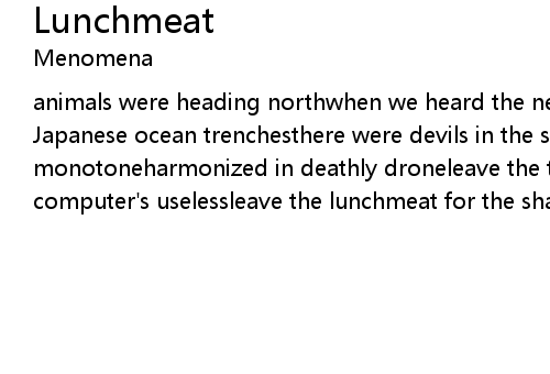 | Japanese ocean trenchesthere were devils in the sandsirens sing in monotoneharmonized in deathly droneleave the tables, the curtains, the computer's uselessleave the lunchmeat for the sharks(I roam) |