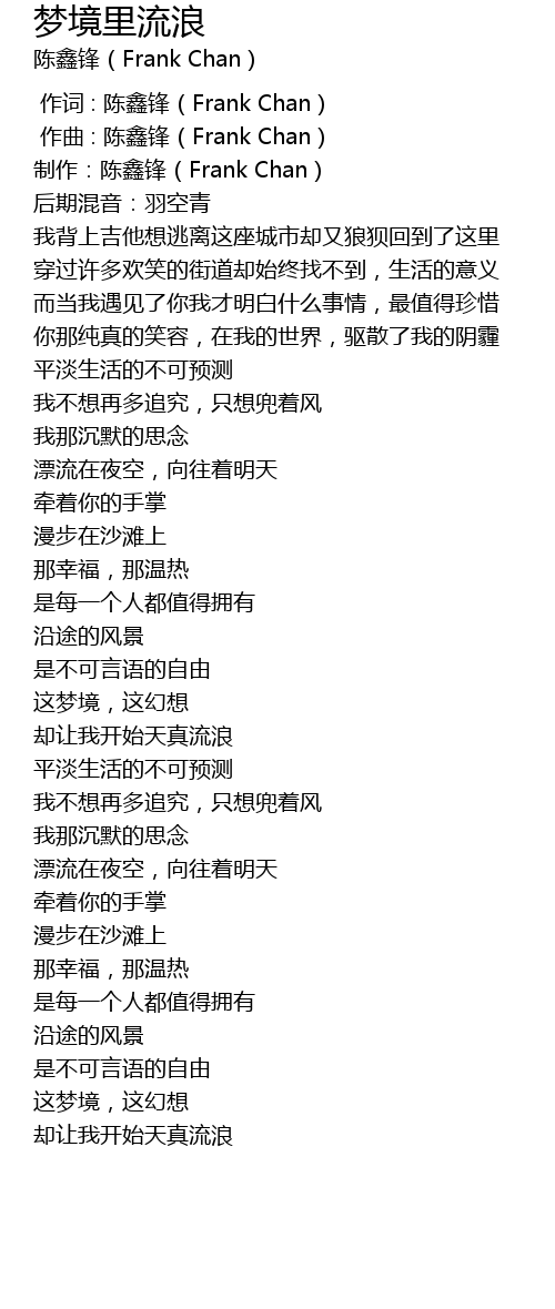 | [00:00.000] | 作词 : 陈鑫锋(Frank Chan) |