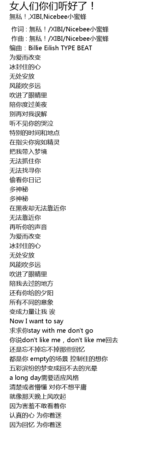 | [00:01.000] | zuò qǔ : wú sī! XIBI Nicebee xiǎo mì fēng |